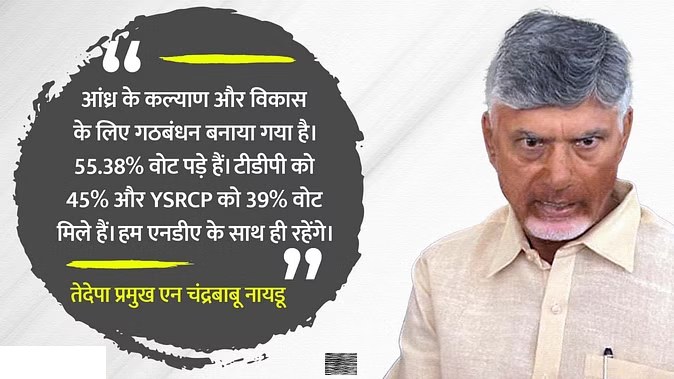 नायडू ने कहा कि राज्य के कल्याण और विकास के लिए गठबंधन बनाया गया है। 55.38% वोट पड़े हैं। टीडीपी को 45% और YSRCP को 39% वोट मिले। कई टीडीपी कार्यकर्ताओं की रातों की नींद उड़ गई है और उन्हें प्रताड़ित किया गया है। यहां तक कि राज्य में मीडिया को भी बाधित किया गया और मीडिया हाउसों पर सीआईडी मामले दर्ज किए गए।