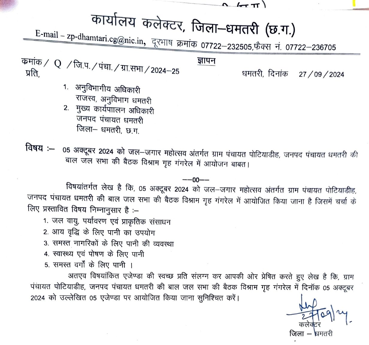 धमतरी, 5 अक्टूबर 2024: जिले में जल प्रबंधन और ग्राम सभाओं की भूमिका को सशक्त करने के उद्देश्य से कलेक्टर ने “जल जागर महोत्सव” के दौरान विशेष ग्राम जल सभा के आयोजन की घोषणा की है। यह सभा 5 अक्टूबर 2024 को विश्राम गृह, गंगरेल, धमतरी में आयोजित की जाएगी।